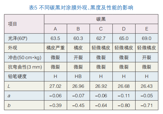 颜料在工业涂料配方中提供着色和遮盖,除紫外线固化涂料外,高黑度工业黑漆均采用碳黑为唯一颜料[4]。碳黑广泛应用于橡胶、油墨、涂料等行业领域,高色素碳黑能提供极高的黑度和蓝色相,在和其它颜料复配时可降低涂膜整体的艳度和饱和度[5]。表5为不同碳黑对低温固化黑色粉末涂料涂膜外观、黑度及性能的影响。